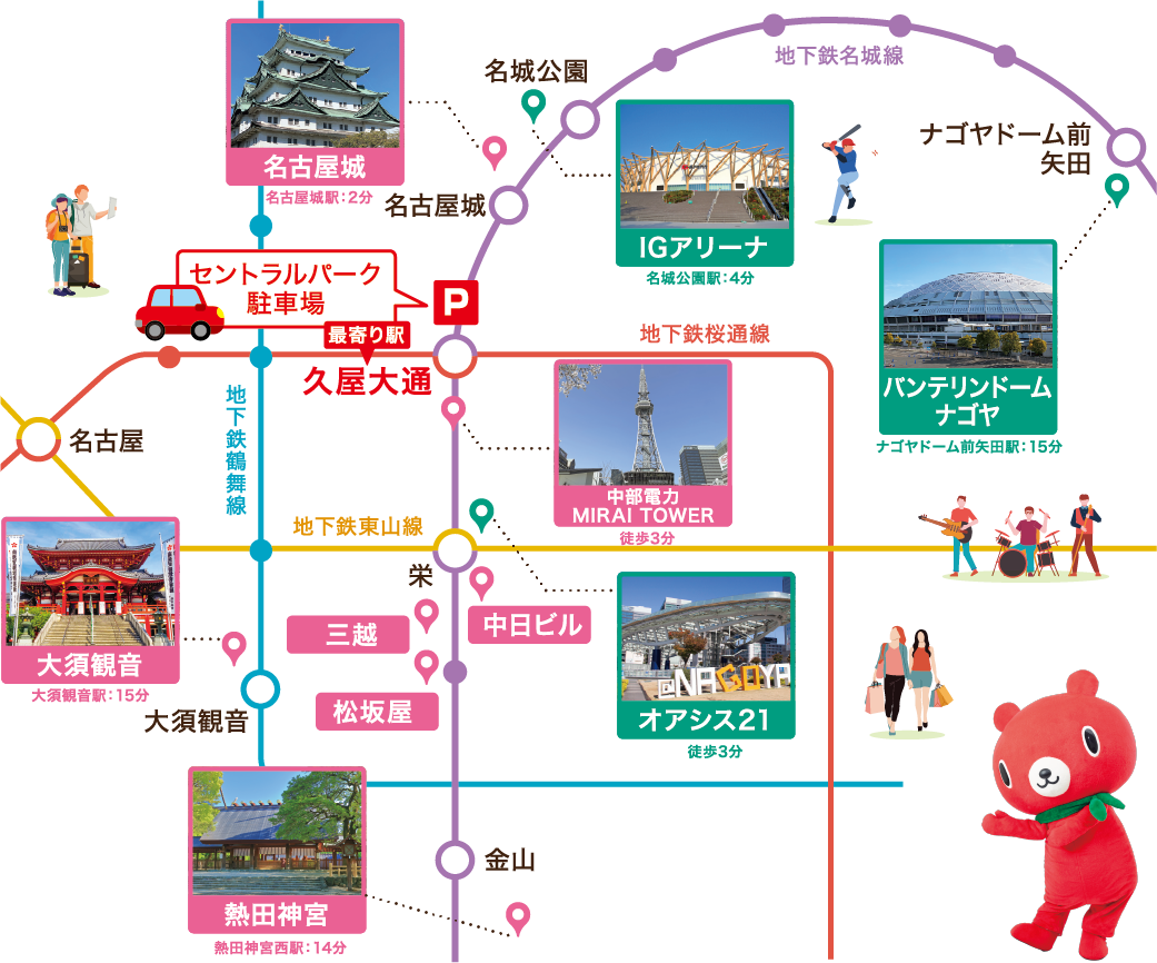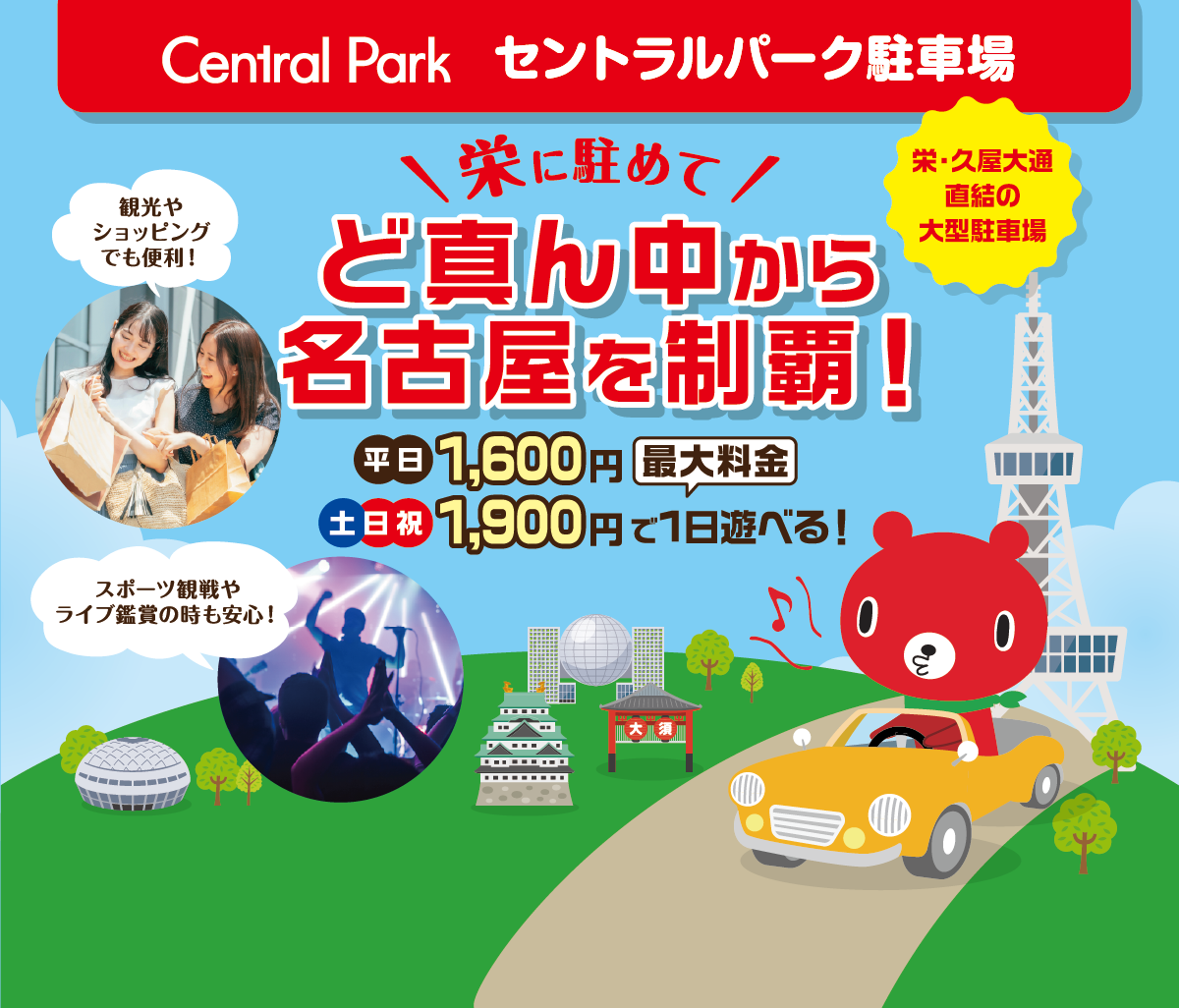 セントラルパーク駐車場 | 栄に駐めて、ど真ん中から名古屋を制覇!【栄・久屋大通直結の大型駐車場】最大料金 平日1,600円 土日祝1,900円で1日遊べる!「観光やショッピングでも便利!」「スポーツ観戦やライブ鑑賞の時も安心!」