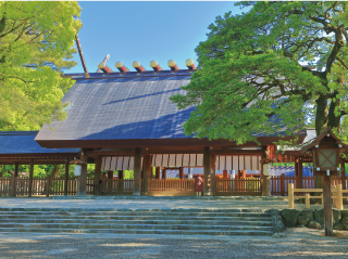 壮大な森に包まれた社殿は神聖そのもの。鳥居をくぐると聞こえてくるせせらぎや鳥のさえずりが心地よく、厳かな空気に包まれます。三種の神器の一つ草薙剣を祀る歴史ある境内で心を浄化し、古の雅を肌で感じられます。