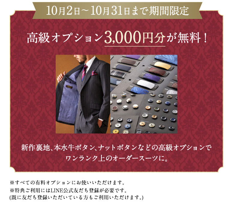 裏地やボタンなどこだわれる高級オプション3,000円分プレゼント!