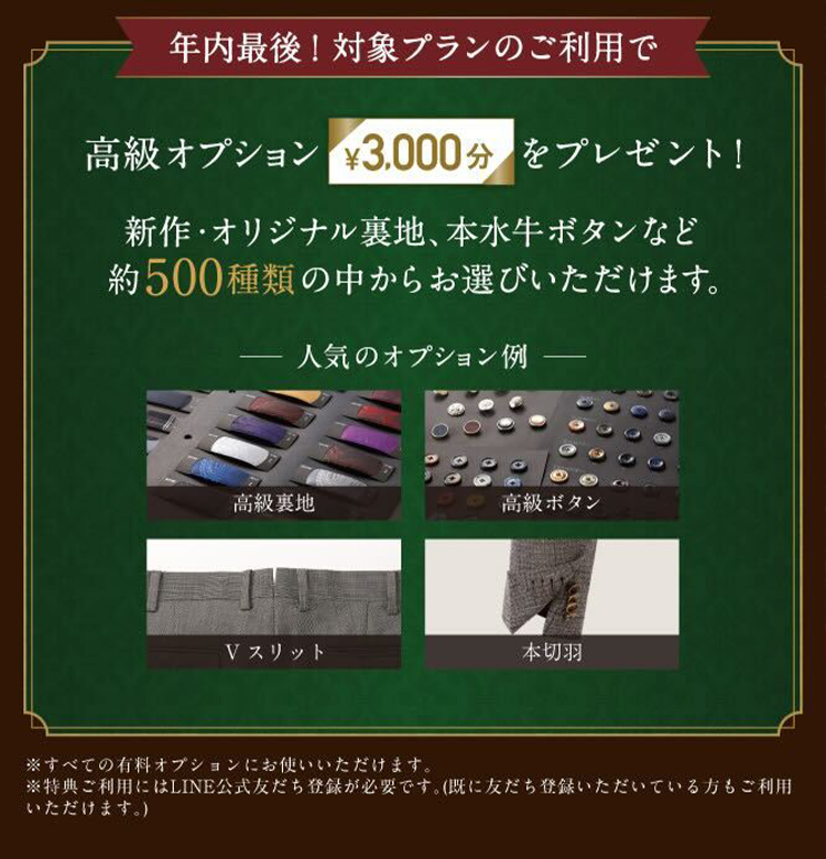 自分へのご褒美やご友人へプレゼントにも最適な「高級オプション3,000円分」の特典で上質なスーツを。