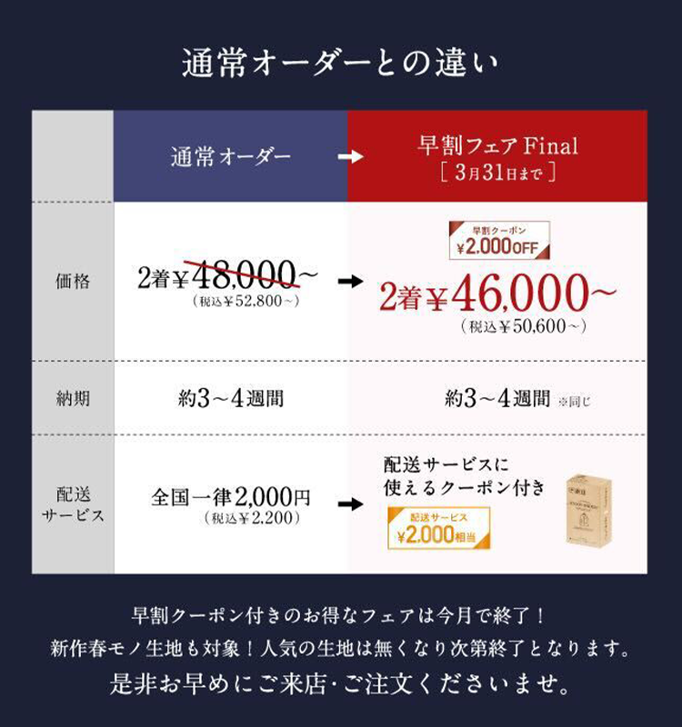 【早割FINAL】お得なクーポン付き!オーダースーツ2着50,600円~