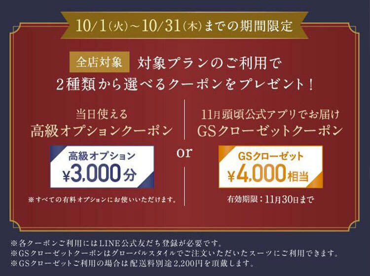「高級オプション3,000円分」or「4,000円相当GSクローゼットお試しクーポン」どちらか好きな方を選べる特典付き!