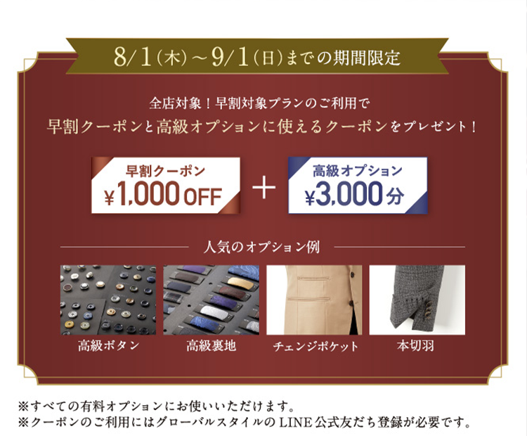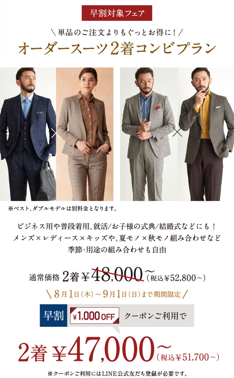 8/1-9/1までの期間限定でオーダースーツ2着コンビフェアを開催中。