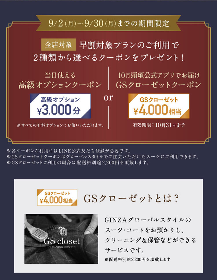 「高級オプション3,000円分」or「4,000円相当GSクローゼットお試しクーポン」どちらか好きな方を選べる特典付き!
