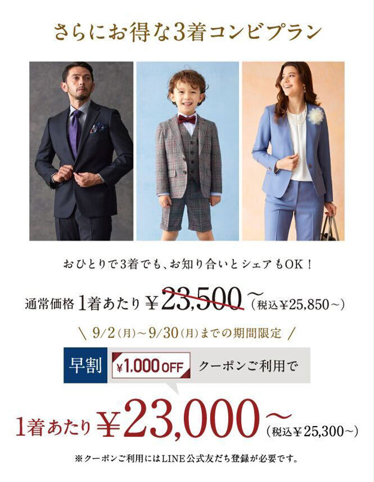 【3着同時ご注文なら1着あたり25,300円~】⇀さらに4,000円相当等の選べる特典クーポン付き!オーダースーツフェア