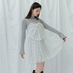 胸元の大きなリボンとリボン柄チュールがポイントのドッキングニットワンピース。
