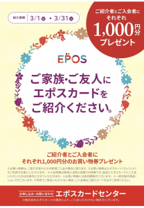 *お買い物券は、ご紹介を受けた方が新規ご入会の場合に限ります。*お買い物券はエポスカード(クレジット)のご利用でお使いいただけます。ご同伴でご来店いただけない場合、ご入会者はご紹介カードを必ずご持参ください。