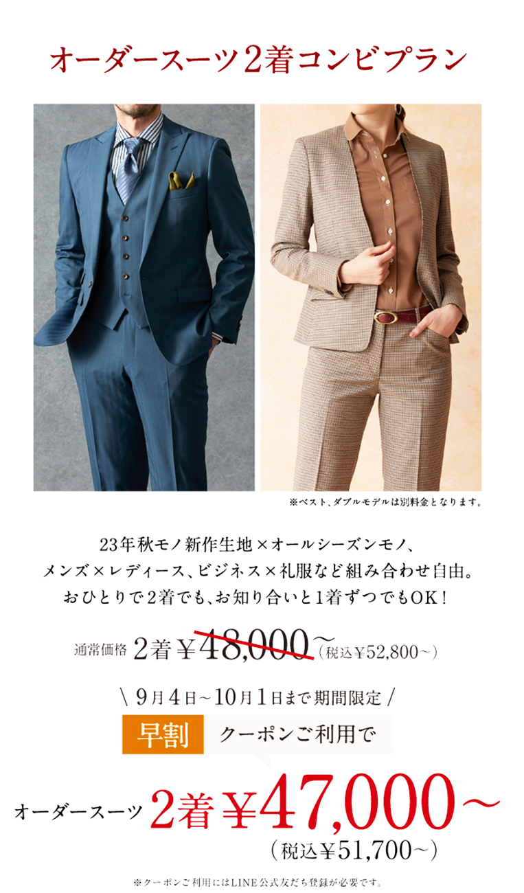 オーダースーツ2着コンビプラン 47,000円~(税込51,700円~)