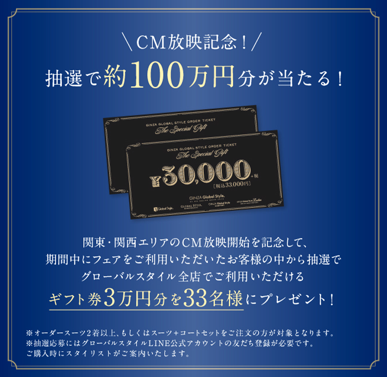 オーダースーツ早割コンビフェア”FINAL”開催!CM放映記念でギフト券があたるチャンス!