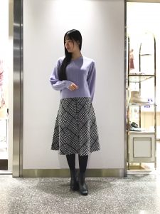 優しいブルーのカラーニットに、モノトーン系のスカートをコーディネート。