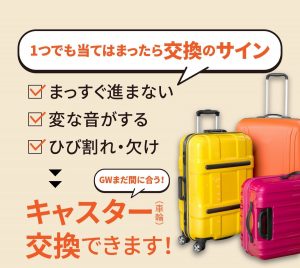 Shop Newsショップニュース 2026.04.28 スーツケース・キャリーケースのキャスター交換いたします! MISTER MINIT もどる MISTER MINIT ミスターミニット No.1サービス・その他電話番号:052-951-4163営業時間:10:00~21:00 (日曜祝日は10:00~20:00) ショップページへ もどる
