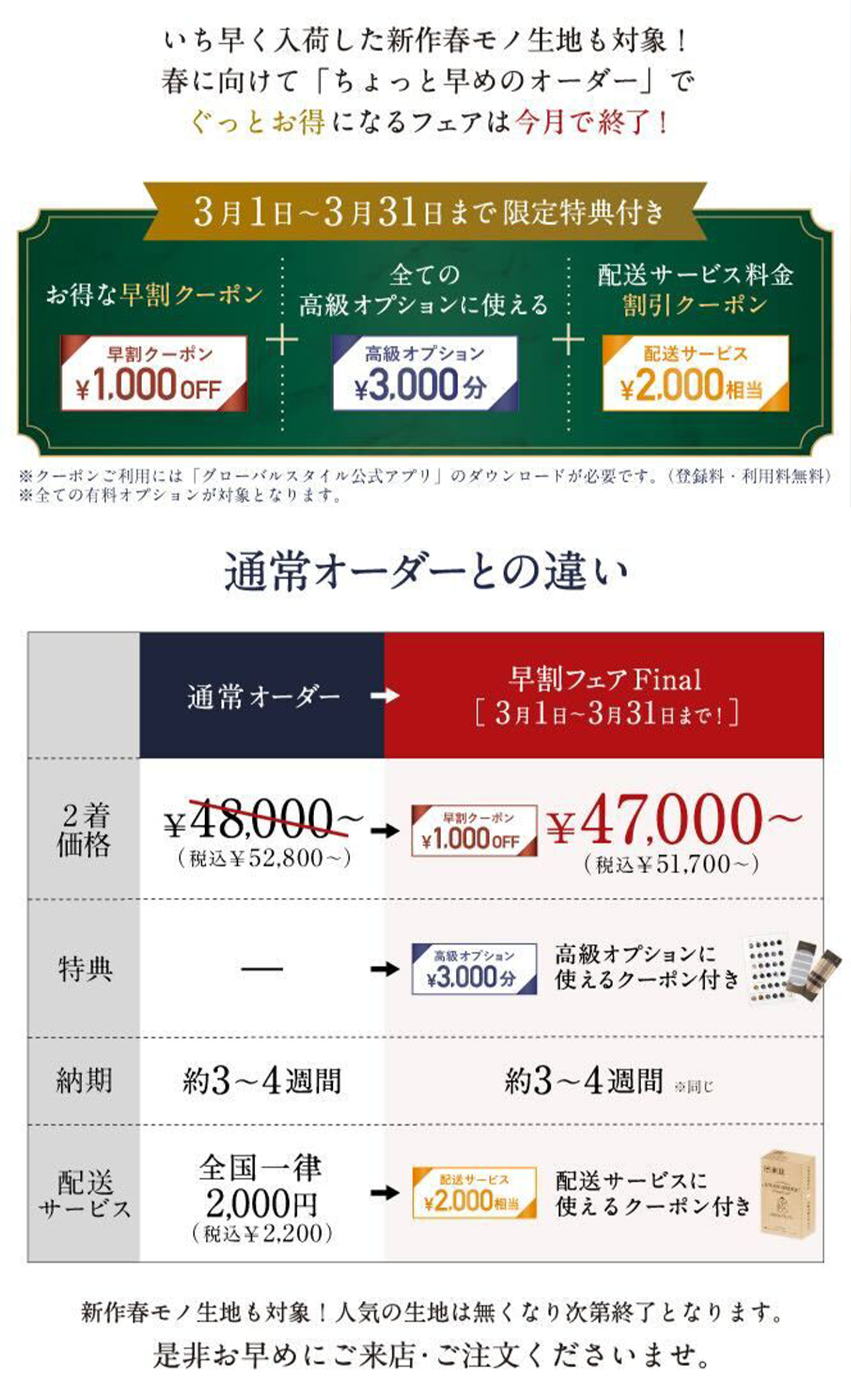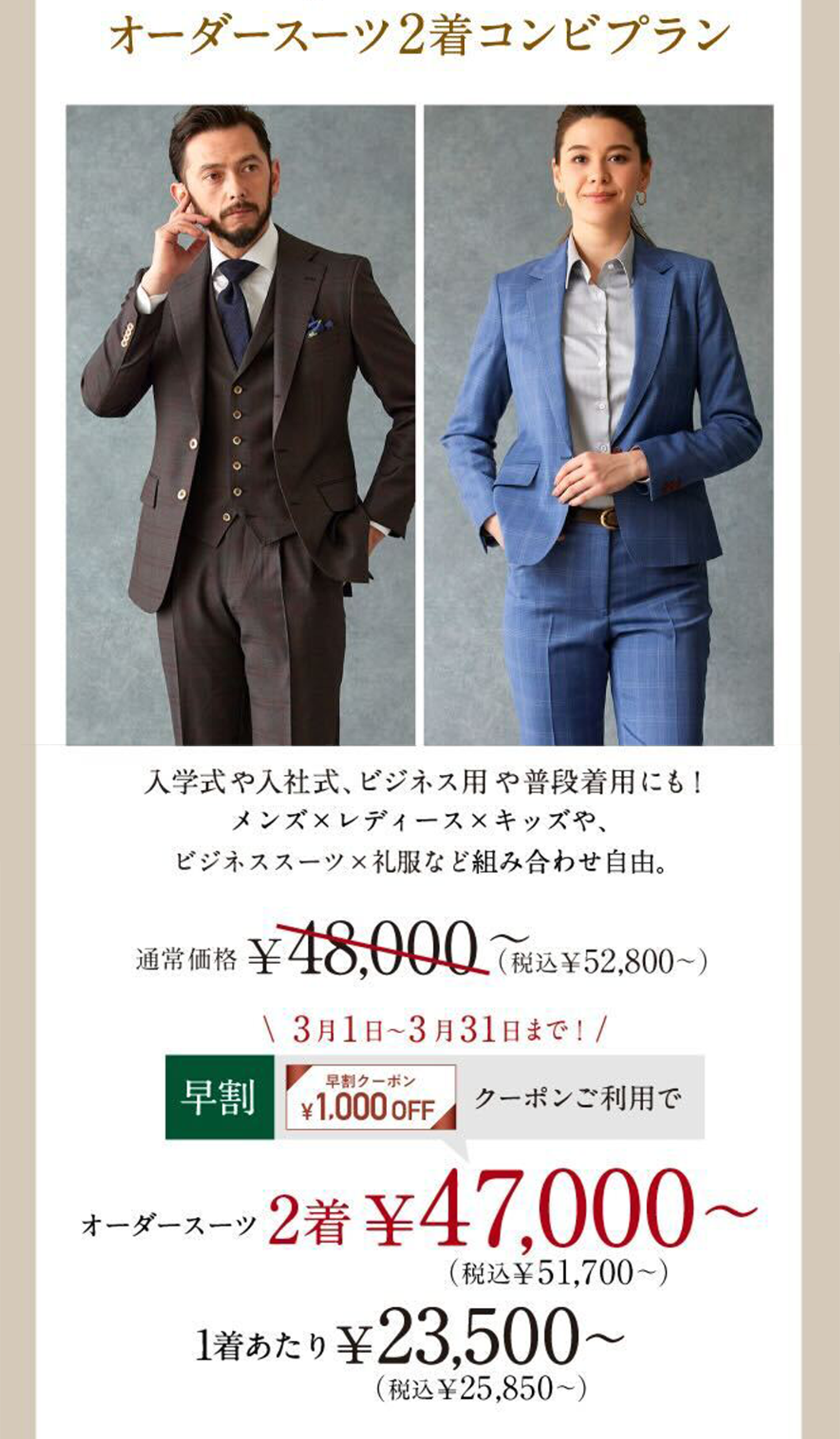 新作生地からフォーマルスーツ生地など組み合わせ自由でオーダー出来るオーダースーツ2着コンビフェアを期間限定開催!