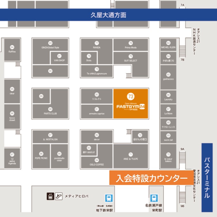 名鉄瀬戸線「栄町」駅改札を出てすぐ、コスメショップ「アインズ&トルぺ」さん前に