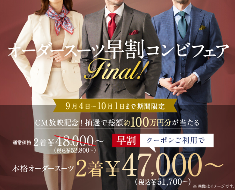 最後の早割フェア!1着あたり2万円台~「オーダースーツ早割コンビフェアFINAL」