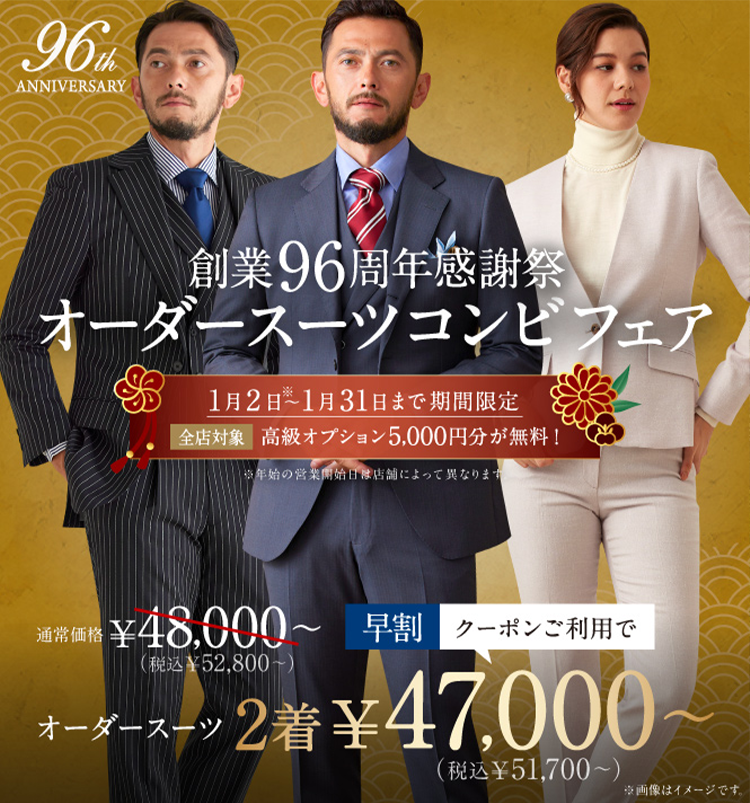 【創業97周年感謝祭】全店対象!オーダースーツ2着で選べる豪華特典付き