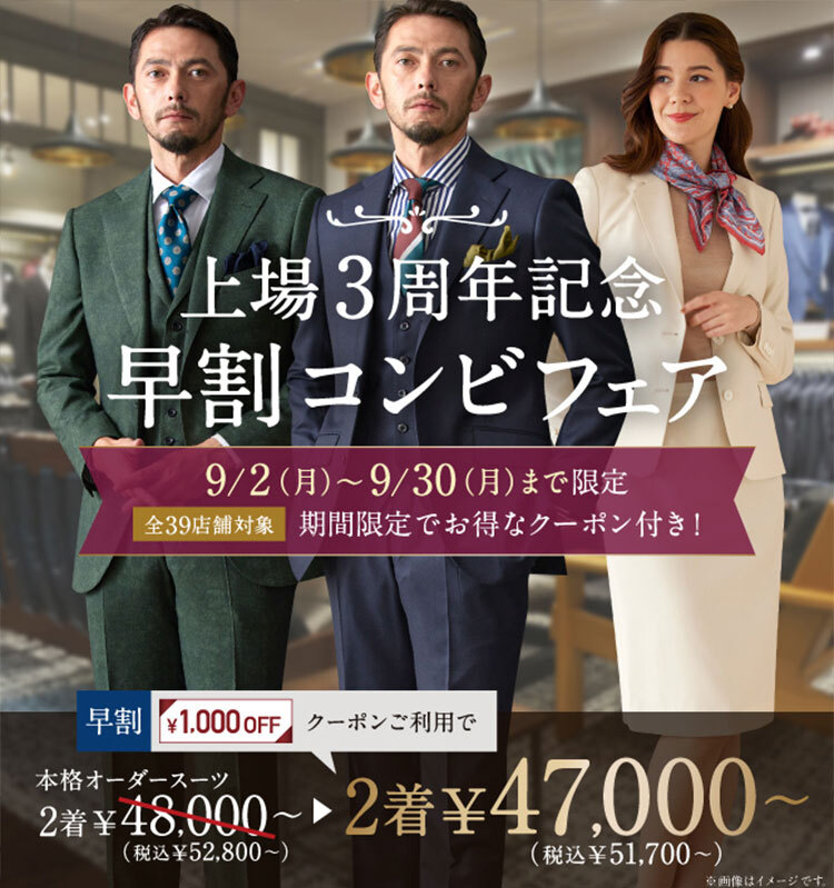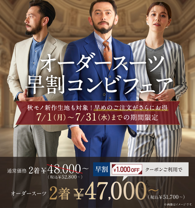 3,000円OFFクーポン付き!1着あたり2万円台~「オーダースーツ早割コンビフェア」