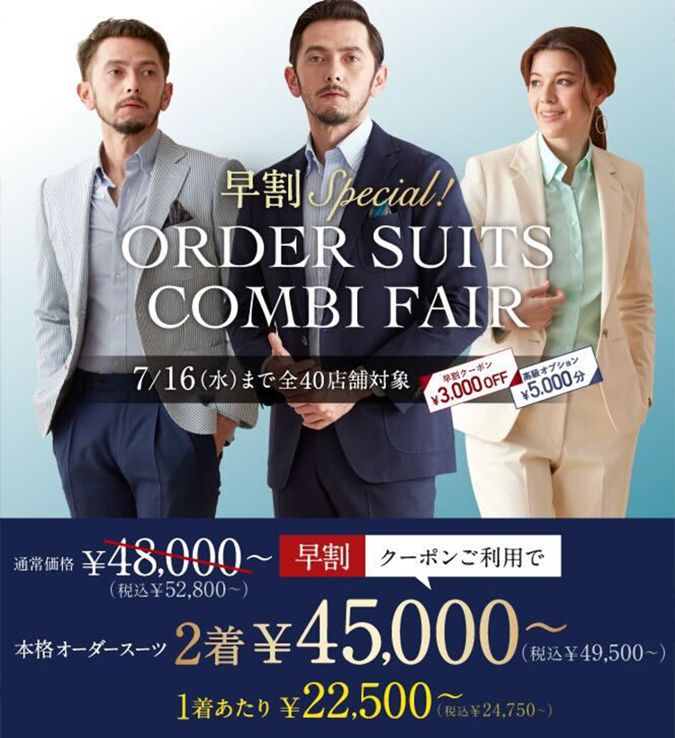 早割クーポン3,000円付き!オーダースーツ早割コンビフェア Special!